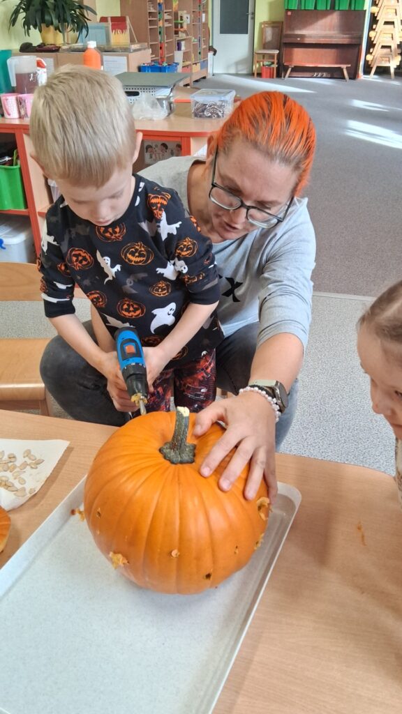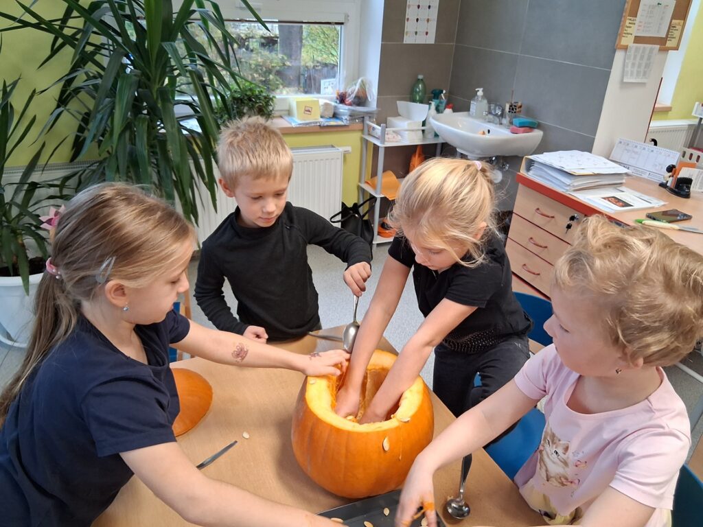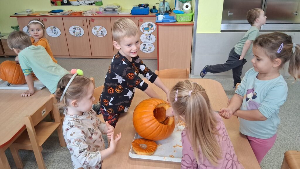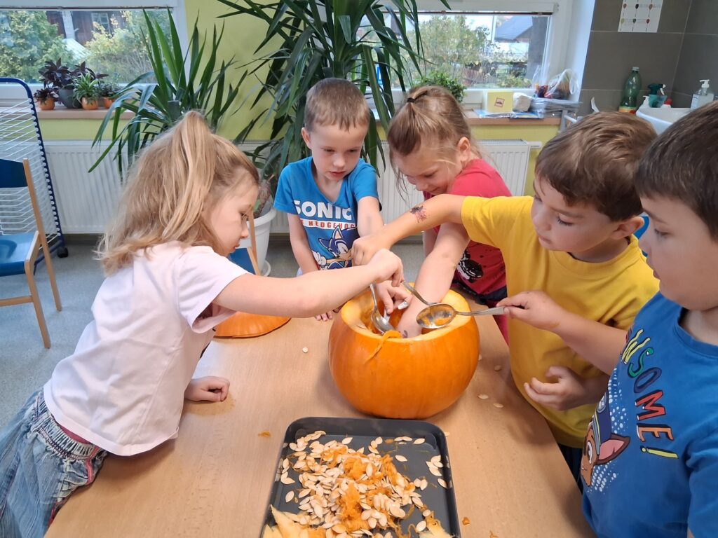 Naše školková zahrádka letos přinesla dětem velkou radost, a to krom jiného, i vlastní úrodu oranžových dýní. Ty děti využily při oslavě Halloweenu v Mš. Celý týden se děti seznamovaly s tradicí Dušiček, zapalovaly svíčky pro zbloudilé duše, vyzkoušely si pokus s vodou a svíčkou, která spotřebovala všechen kyslík ve sklenici a vzniklý podtlak vtáhl vodu dovnitř. Zacvičily si se šátky a předváděly tanec duchů. Na konci týdne na děti čekalo seznámení se svátkem Halloween, poznaly jeho původ i význam vydlabaných dýní se svíčkou uvnitř. Všechny třídy se zapojily do tvoření strašidelných dýní. Děti vydlabávaly, vyřezávaly, vrtaly pomocí aku vrtačky malé otvory a společně s paní učitelkami vytvářely strašidelné, ale i veselé obličeje. Každá dýně měla svůj výraz a příběh. Nezapomnělo se ani na dýňová semínka, která děti vyndaly z dužiny a nechaly je uschnout pro příští sadbu na školkové zahrádce. Závěr týdne patřil reji masek, který doprovázel nekonečný ohňostroj bublinek. Atmosféra byla kouzelná a děti si odnesly nejen zážitek z dlabání dýní, ale i nové poznatky o tradicích našich předků.