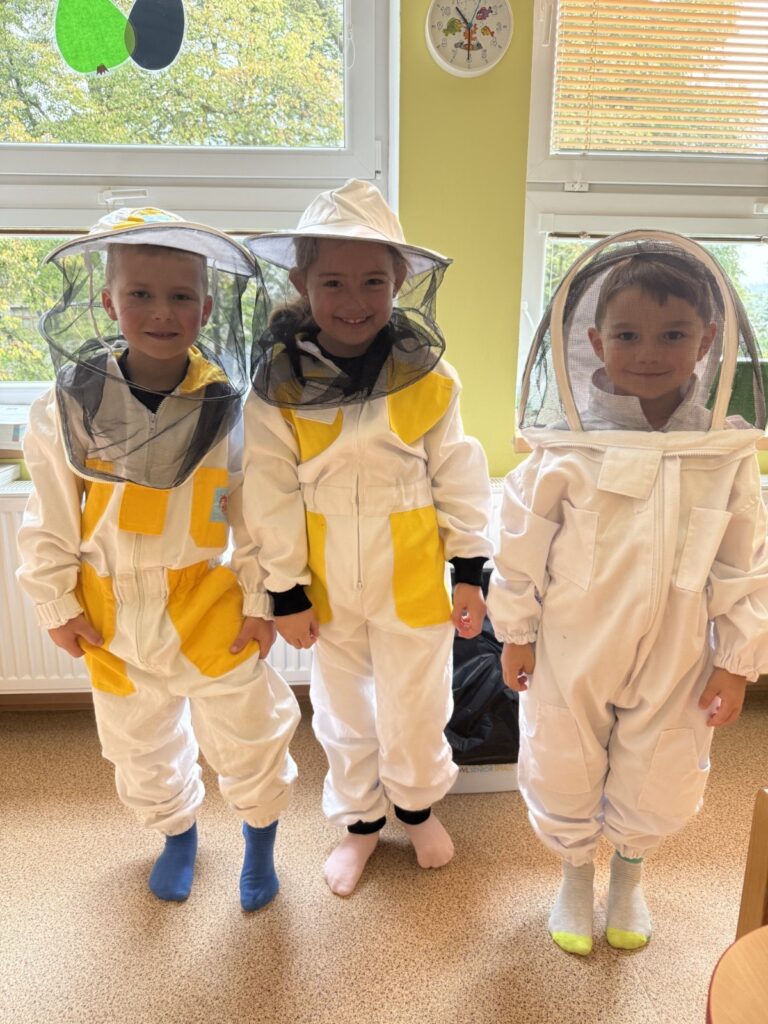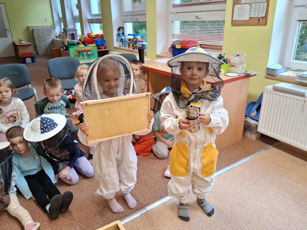 Do naší školky zavítala paní včelařka Kateřina až z dalekého Litvínova. Milá paní, která s sebou přivezla nejen živé včelstvo s královnou, ale i řadu pomůcek včelaře. Program o včelkách měla připravený s ohledem na věk dětí. Povídala o životě včel, nechala dětem vyzkoušet ochranný oblek, klobouky se síťkou proti bodnutí hmyzem. Představila dětem včelařský dýmák, který slouží k vykuřování, uklidnění včel, ale hlavně k ochraně včelaře, když vykonává práci v těsné blízkosti nebo uvnitř úlu.