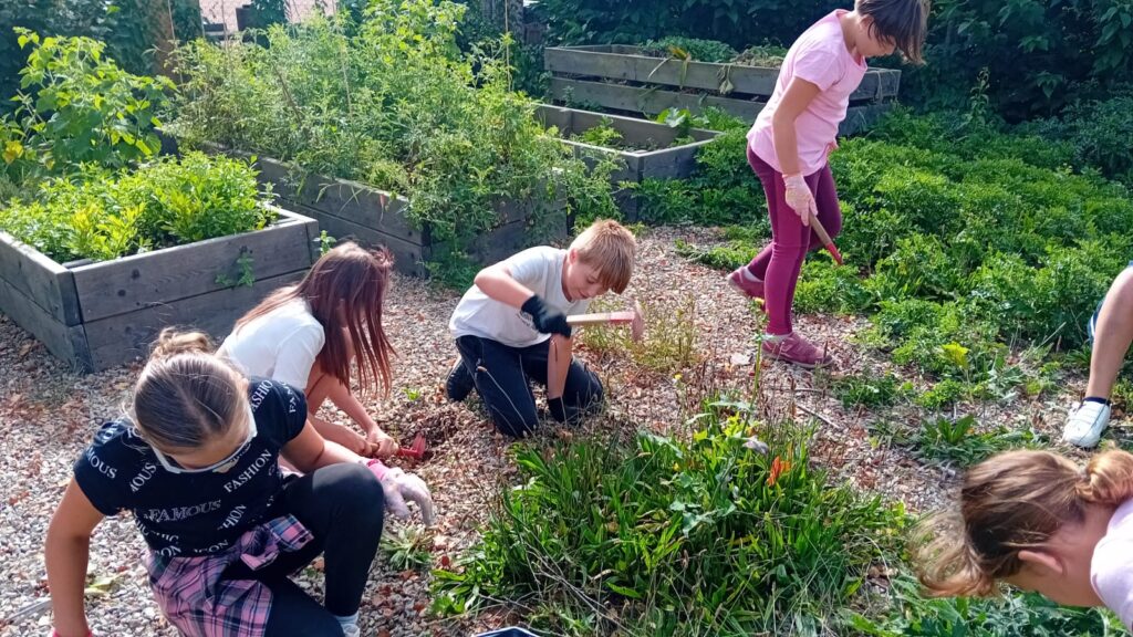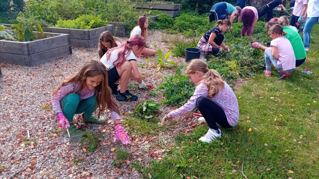 Práce šla dětem od ruky – s nadšením se chopily motyček a hrábí a pomáhaly upravit záhony tak, aby byly připravené na podzimní výsadbu.