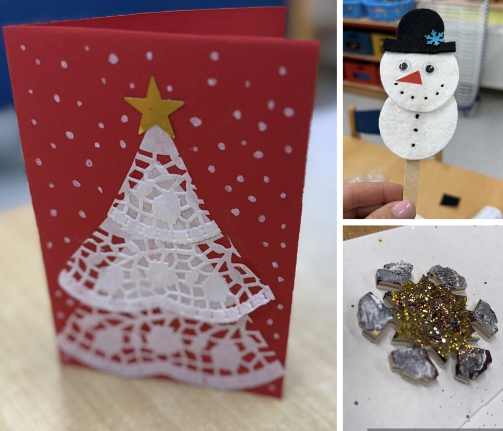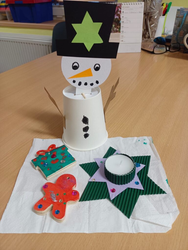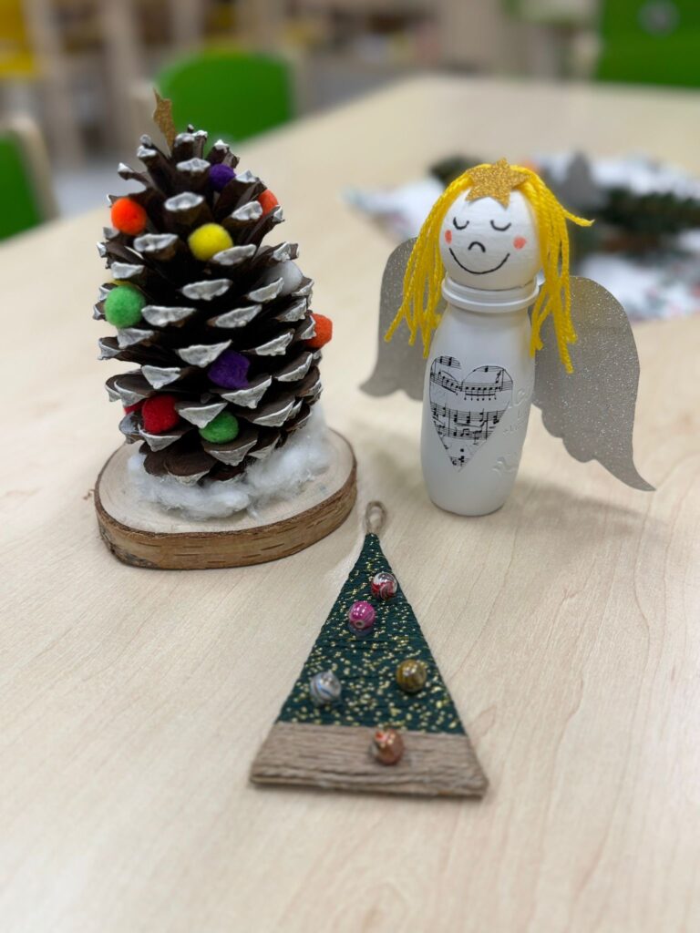 V každé třídě si paní učitelky připravily celou řadu kreativních výrobků. U Rybiček si návštěvníci vyzkoušeli výrobu sněhuláka z kelímku na kávu, který hýbal hlavičkou, svícen ve tvaru hvězdy a ozdoby z překližky. Ve třídě Lvíčata se vyráběla vánoční přání z krajkového papíru, zápich sněhuláka z vatových tamponků a překližkové vločky s drahokamy. U Včeliček se rodili pod rukama dětí andílci z kelímků od jogurtů, stromečky ze šišek a z kartonu omotaného vlnou. A ve třídě Sluníčka nechyběl velký anděl z papírového kornoutu, svícen z jehličnatých větviček a vánoční stromeček prošívaný vlnou s navlečenými korálky. Fantazii se meze nekladly a každý výrobek byl originálem.