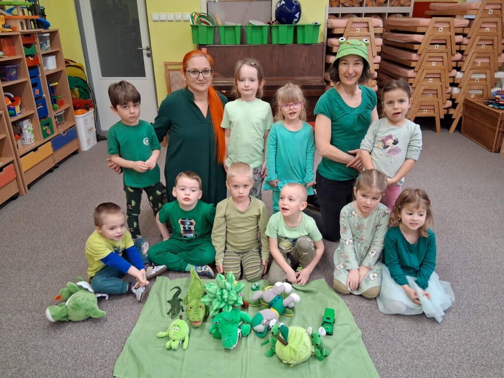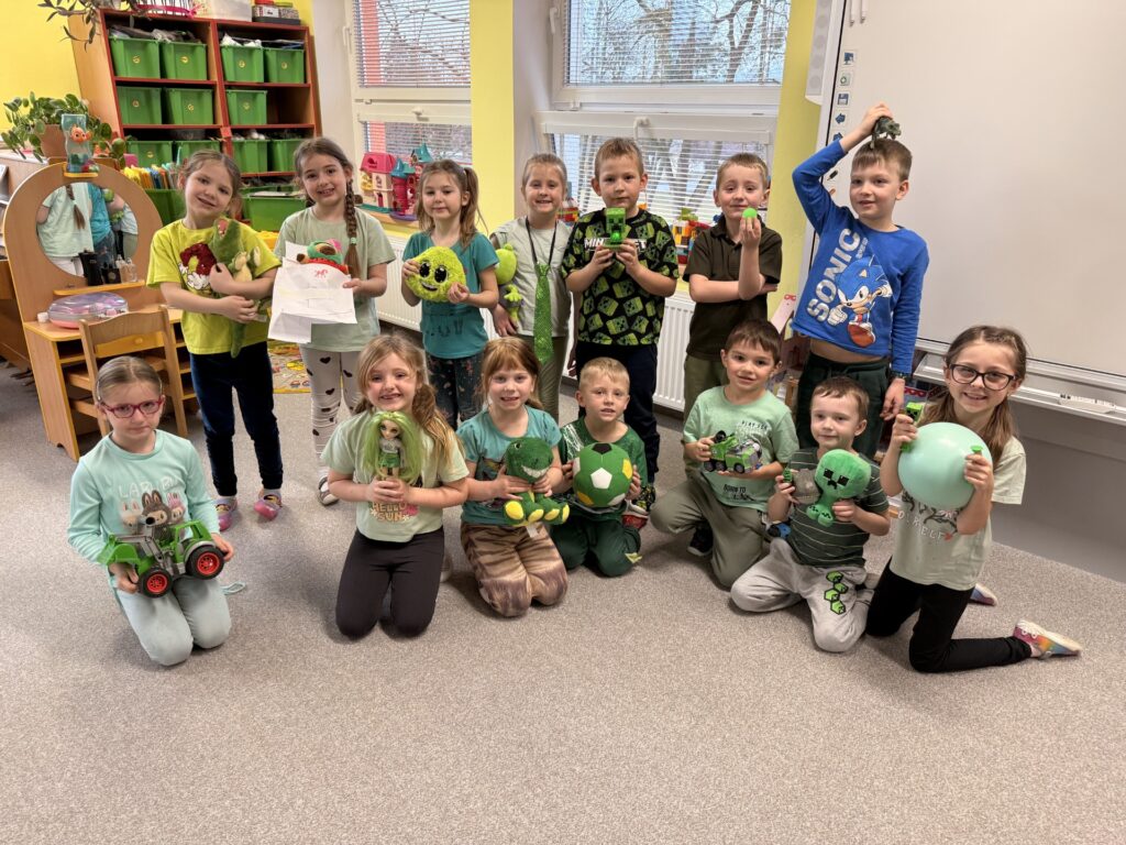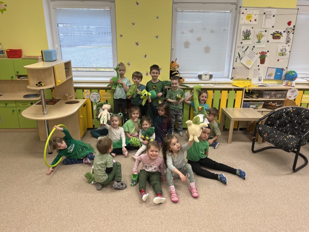 Do naší mateřské školy zavítala pravá jarní atmosféra v podobě oblíbeného barevného dne, na který se těšily nejen děti, ale i paní učitelky. Celý den se nesl v duchu zelené barvy, radosti z pohybu, tvoření i objevování. Program byl pestrý a přizpůsobený všem dětem tak, aby si každý našel to své. Děti si vyzkoušely zajímavé pokusy, například míchání barevných inkoustů nebo vytváření vodního víru, které v nich probudily zvídavost a nadšení pro objevování. Nechyběla ani ortomotorická cvičení s veselou želé žabkou, při kterých si procvičily jemnou motoriku. Velký úspěch měly také pohybové hry zaměřené na hledání zelených předmětů ve třídě, stejně jako oblíbené hry „Na žabičky“ a „Na semafor“. Děti si procvičily nejen postřeh, ale i spolupráci a radost z pohybu. Kreativní část dne patřila tvoření. Děti vyráběly papírové žabky, jarní květiny a také vymýšlely originální názvy pro zvířata zelené barvy. Nechyběl ani společný rozhovor o tom, co si kdo přinesl zeleného, který podpořil komunikaci a sdílení zážitků mezi dětmi. O příjemné překvapení se postaraly také paní kuchařky, které dětem připravily tématické občerstvení. Ke svačině si děti pochutnaly na zelené buchtě a k obědu nechyběla špenátová příloha. Zelený den byl plný smíchu, radosti a nových zážitků. Ukázal, že i obyčejná barva může spojit děti v jeden velký příběh plný her, tvoření a objevování.